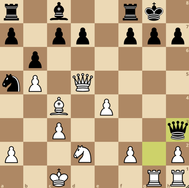 Die Sensation folgte jedoch in der Nachmittagsrunde im Duell zwischen Carlo Steinfeldt und Moritz Charchulla. Der an eins gesetzte Moritz rochierte in eine geöffnete g-Linie hinein und musste sich kurz darauf einem wunderschön ausgeführten Matt in 7 Zügen beugen (siehe Diagramm unten). Damit ist Carlo Steinfeldt mit 3 Punkten alleiniger Führender der Gruppe, dicht gefolgt von einem Verfolgerfeld mit nur einem halben Punkt Rückstand. In der U14w führt aktuell Julia Marie Junge mit 1,5 Punkten.