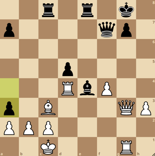 In der Spitzenpartie am Nachmittag trafen Hanno Hellenbroich und Chidera Aguike aufeinander. Hanno brachte ein seltenes Mittelgambit aufs Brett und sah über weite Strecken wie der sichere Sieger aus. Doch er verpasste die gewinnbringenden Fortsetzungen (siehe Diagramm unten), das Blatt wendete sich und Chidera sicherte sich den Sieg sowie die alleinige Tabellenführung mit 3 Punkten. Es folgen drei Spieler mit 2,5 Punkten: Ida Klara Kutz (derzeit beste U16w), Darian Farokhi und Conan Sasse.